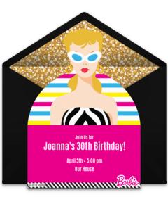 Use the messaging feature in our Online Invitations to encourage your guests to dress up in their favorite Barbie-inspired costumes. Barbie has had many careers through the years - from Flight Attendant to Pilot, Astronaut, Presidential Candidate, Olympic Athlete, Marine Biologist, and many more. Between her many careers and her many iconic outfits like the 1959 Black and White Striped Bathing Suit and the Business Suit and Cocktail Dress of 1985's Day to Night Barbie, your guests will have a huge range of options to choose from. And don't forget - Ken has his own range of classic looks! Choose your favorite decorations in Barbie pink and get the Barbie party started!