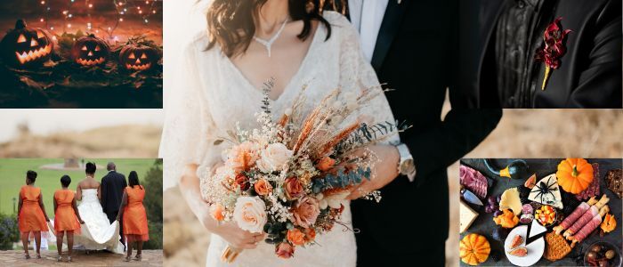 For a more traditional look, choose orange florals, or have your attendants wear orange. Create centerpieces with tiny jack-o-lanterns between twinkling fairy lights. And for a fun touch, serve Halloween-themed charcuterie boards or even a treat-filled candy bar during the reception.