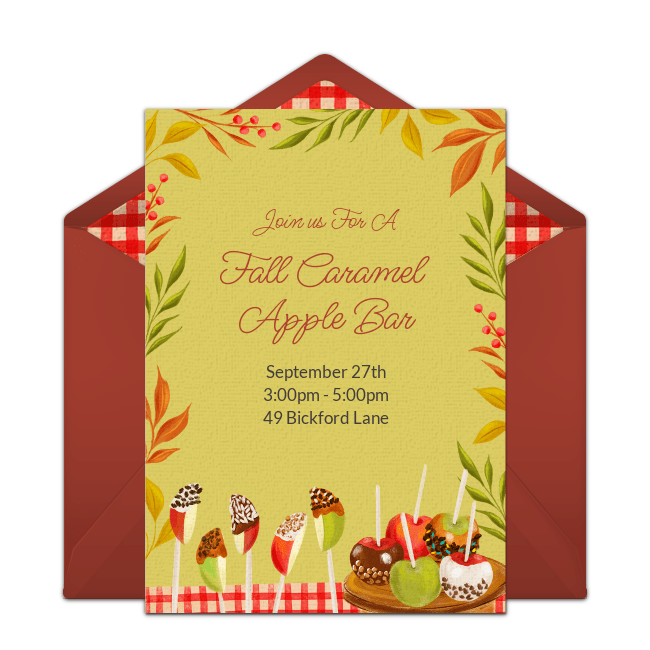 What could be more quintessentially fall? Head over to a local apple orchard to pick your own apples that can later be turned into delicious homemade pies, muffins, and cider. Send an apple picking invitation so friends can join you or host a caramel apple bar party after you've gone picking with this online invitation.