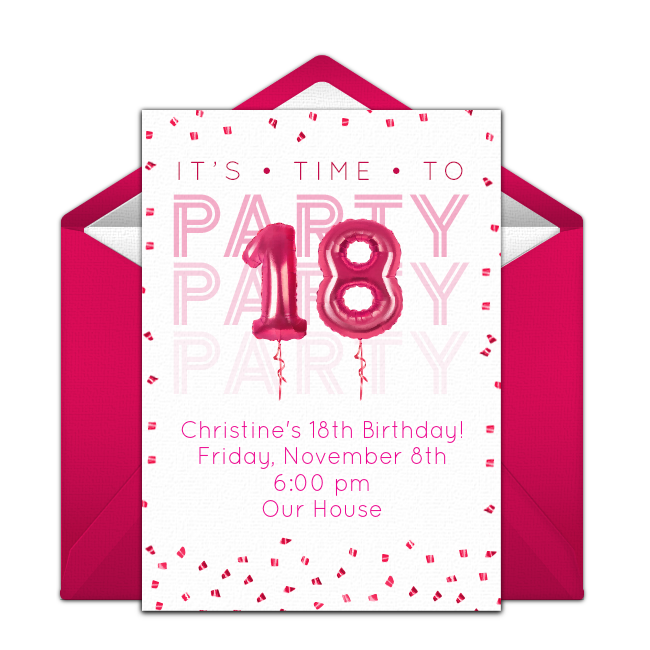Hosting a themed party? Punchbowl offers free online invitations for the following themes: Sleepover, Game Night, Movies & TV, Sports, Music & Dance, Travel, and much more! Remember: You can also find ways to incorporate the theme into the 18th birthday invitation design through specific colors and detailed words or phrases.