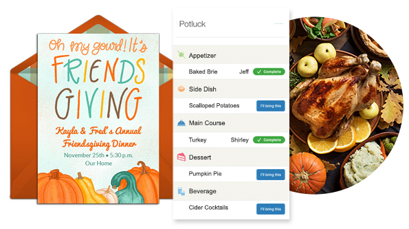 Encourage guests to bring their favorite Thanksgiving recipe and easily track who’s making what with a Potluck Sign Up Tool. The Potluck Tool lets guests write in their contribution or hosts can specify what they’d like each person to bring. Either way, hosts can ensure that there are enough appetizers, main dishes, drinks, and desserts for everyone.