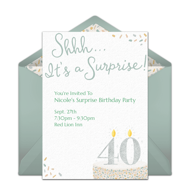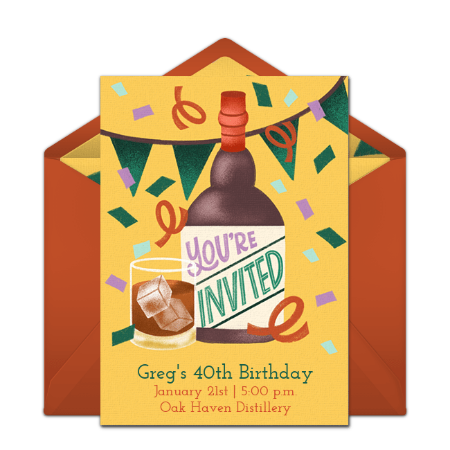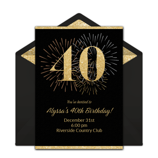 Keep things simple with a party to celebrate the honoree. Browse online 40th birthday invitations, customize your favorite, then deliver it instantly by text or email. To make the celebration special, create a signature cocktail to offer guests, serve hors d'oevres, and have a dessert bar with chocolate covered strawberries, gourmet chocolates, and cordials.