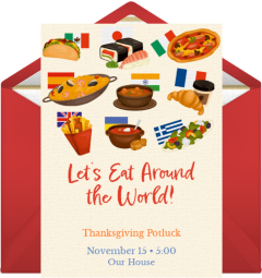 Ask guests to pick a culture of their choosing and make a dish to represent that area and type of cuisine. Encourage them to bring a fusion dish, such as turkey stuffing with Moroccan flavors, or use a traditional recipe. Include a potluck sign up sheet in your invitation. Everyone will enjoy the delicious flavors of feasting around the world!
