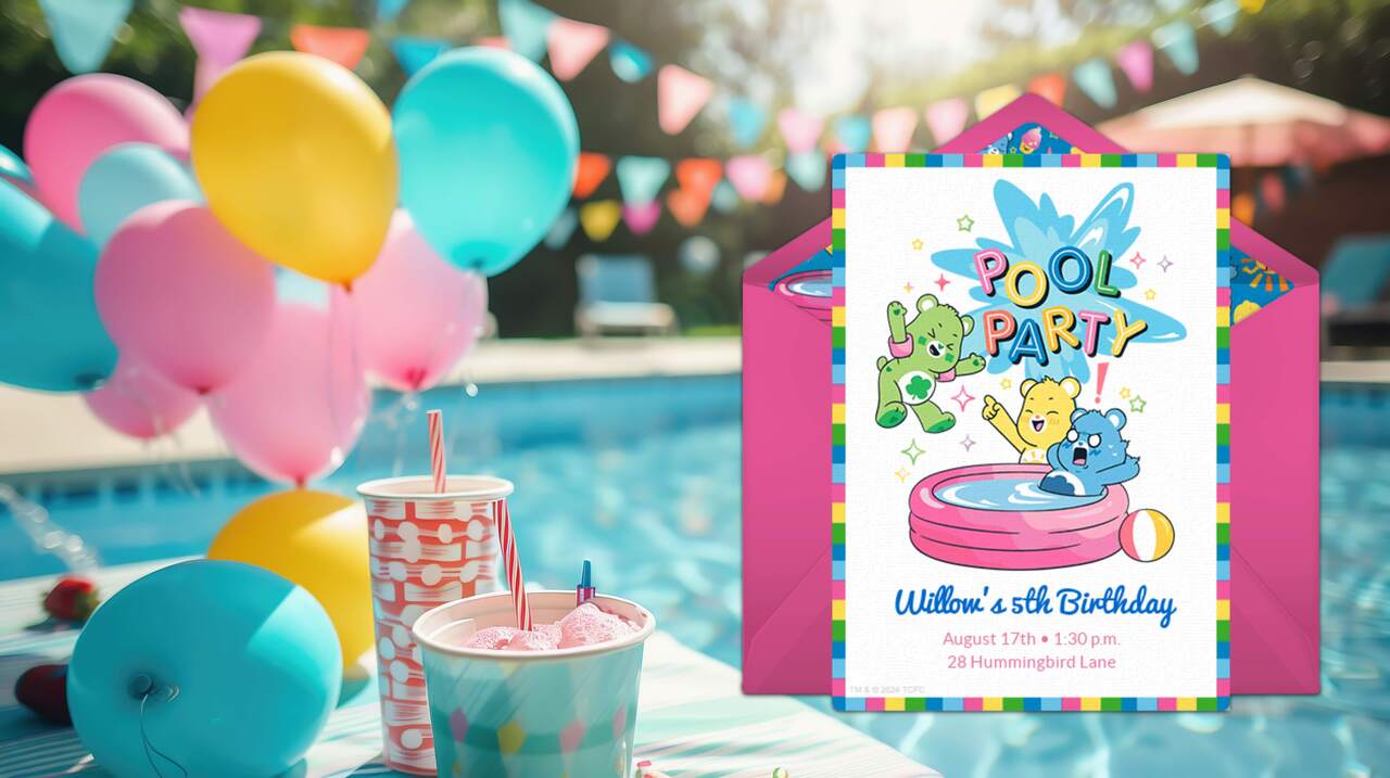 Celebrate the birthday boy or girl with plenty of water games and activities. Have a teen? Plan on lots of lounging, snacking, and listening to music (tip: let them create the playlist!). To start, browse summer birthday invitations like these adorable Care Bears pool party birthday invitations. Once you send out your invitations, get inspired with these birthday pool party ideas.