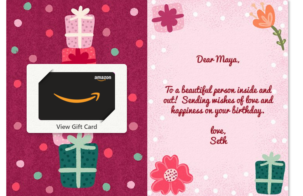 Want to send the birthday honoree something special? Add a digital gift card to your birthday card! Choose from several different gift card brands the recipient will love. Once you pick a brand and gift card amount, it will be delivered inside your birthday greeting card so the recipient can easily view and redeem it.