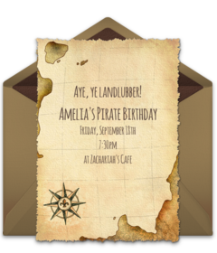 • Invitations: Create your event on Punchbowl to access a variety of kids birthday party invitations including some fabulous pirate designs. Use the invitations to give guests all the details of the party and to add a note for everyone to dress like a pirate for a costume party!