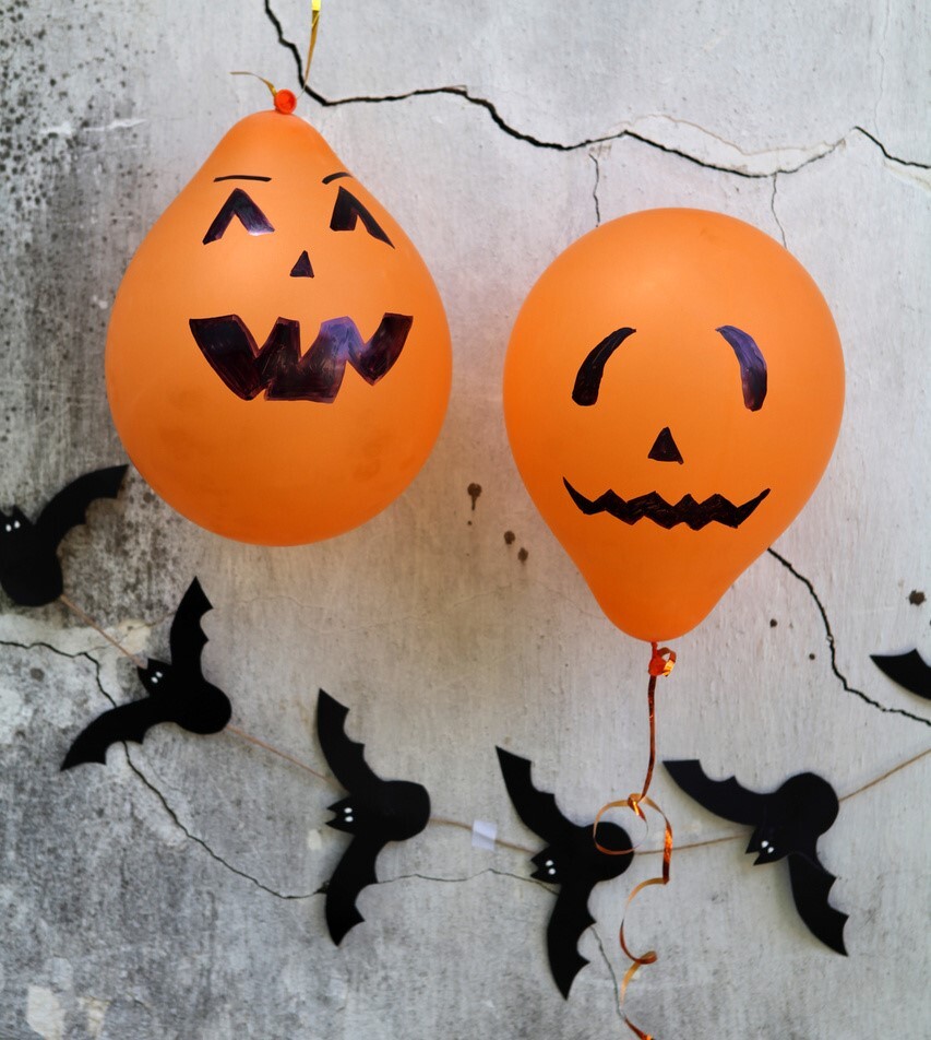 Use creative Halloween decorations that complement your color theme. Pumpkins are a natural choice to incorporate orange into your party, and they provide both decoration and an activity.Encourage guests to decorate them with markers, paint, glitter glue, and more. No carving needed! You could also draw spooky faces on orange and black balloons with black and white paint markers! Place them around your party space at various heights for an easy way to decorate.  If your party is in the evening, hang orange glow sticks from the trees for a creative backdrop to all the fun!