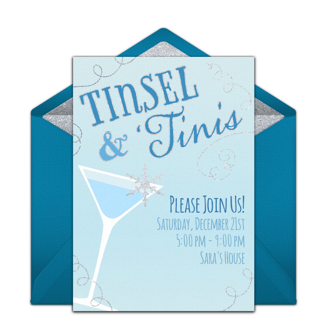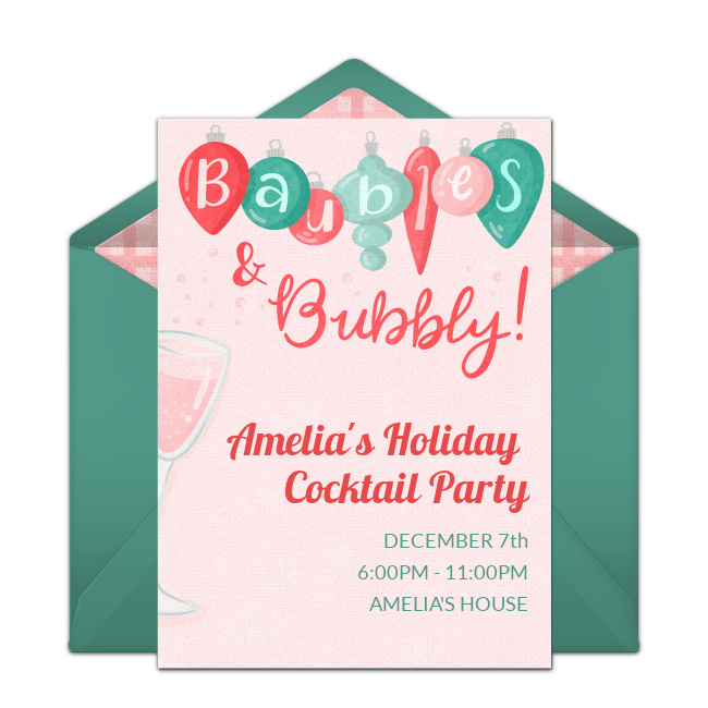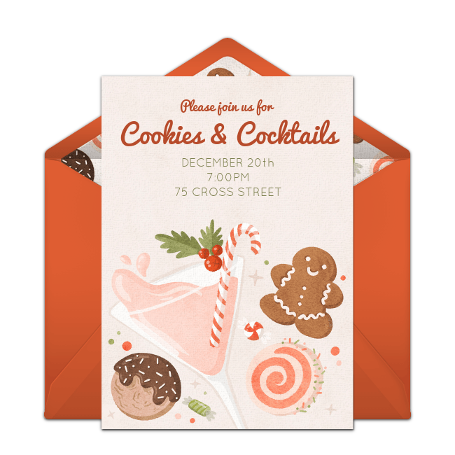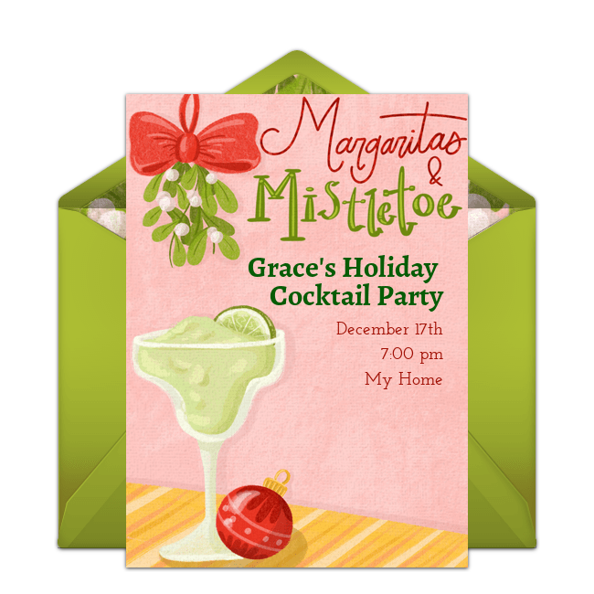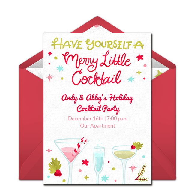 Create your event on Punchbowl and choose a beautiful Christmas cocktail party invitation. Browse several different themes and designs, such as Jingle & Mingle, Cookies & Cocktails, Margaritas & Mistletoe, Baubles & Bubbly, Tinsel & 'Tinis, and Merry LIttle Cocktail. Include information such as the name of the event, name of the host or hostess, date, time, and location. Email or text the invitation 4-6 weeks before the party.