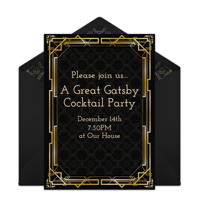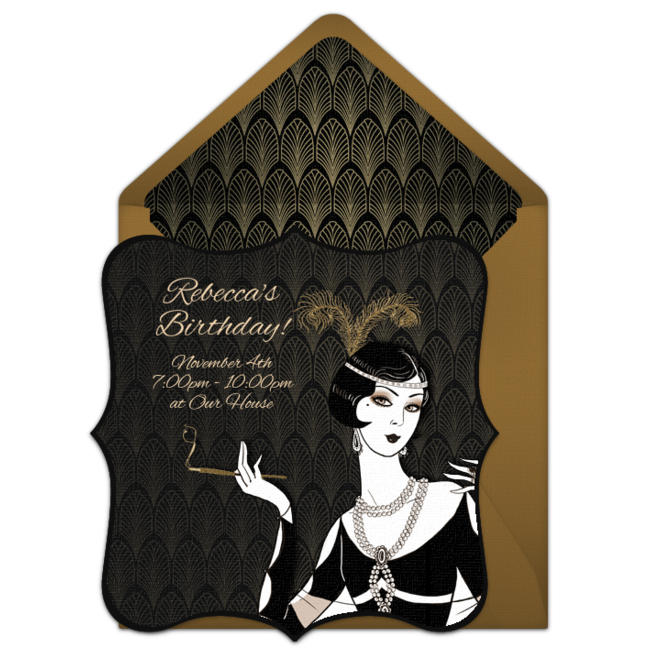 - Invitations: Prepare in advance of sending out your free online invitations for the 1920s theme party, like this 1920s Flapper invitation or this Great Gatsby invitation. Customize your invitation with important party details and let guests know that they should wear 1920s party costumes.Once your invitation is ready, send it by email or text and easily track RSVPs online.