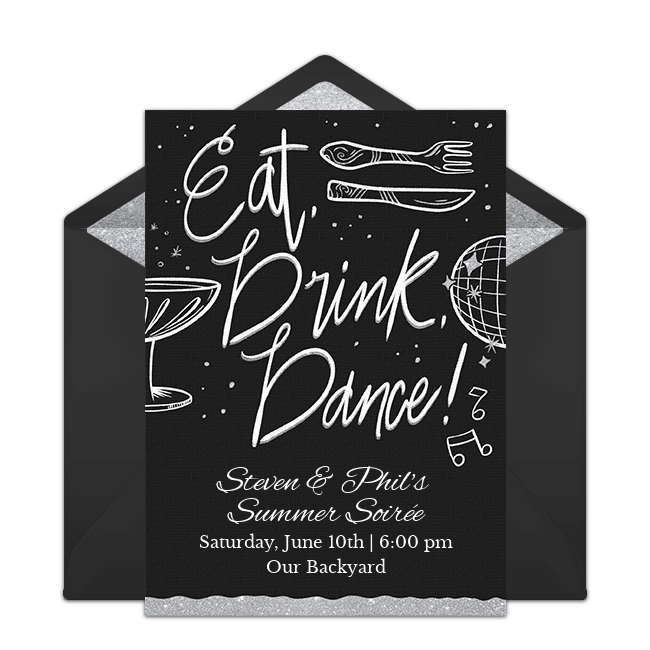 If you love the disco era, throw a 70s-themed disco and dancing cocktail party! Send out these Eat Drink Dance digital invitations featuring a sparkling disco ball to set the stage for your gathering. The décor at the party is important, so include lots of disco-inspired decorations. Things like disco balls, colorful balloons, streamers, glitter and 70s disco music are all perfect.drink-dance-party-invitations.png71.53 KB