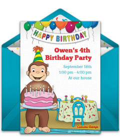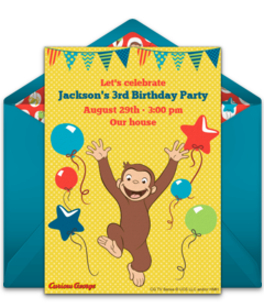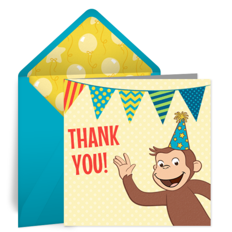 - Thank You Cards: After the celebration, send Curious George Thank You cards online to let guests know how much you appreciate them attending. Personalize the eCards and send via text or email in minutes.