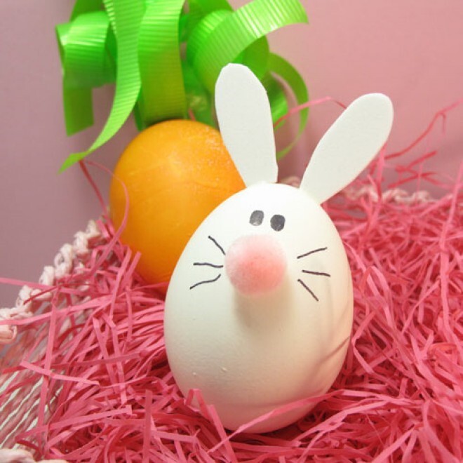 Easter Bunny Eggs Create the fun Easter bunny eggs fast, and with no dye required! All you need are small pink pom-poms, white foam, a black marker, and glue. Simply cut out bunny ear shapes from the white foam and glue them onto the top of the egg. Next, glue a pink pom-pom to the center of the egg for the nose. Once the glue is dry, draw on eyes and whiskers. These adorable bunny eggs are perfect for an Easter egg hunt, an Easter basket, or as a part of your dinner table décor. bunny egg decoration.jpg85.05 KB