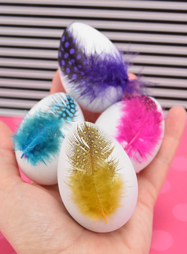Once your initial layer is applied, you can continue to layer feathers of different colors all over your Easter eggs to achieve a bright, upbeat look that will knock those dyed eggs out of the park.