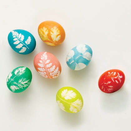 Nature Imprinted Easter Eggs A creative way to add a spring feel to your Easter eggs is with this fun project. Collect flowers and leaves from your yard or a nearby park. Place the leaf or blossom face down on an egg, wrap the egg in a square of nylon pantyhose (or other very thin fabric), and secure with a twist tie or rubber band. Depending on the color you desire, select red onion peels, yellow onions, purple cabbage, or cranberries to use to make dye. Bring a large pot of water to a boil and add the chosen dye ingredients, along with the eggs. Make sure to lower the eggs in very carefully so they don’t crack! Let eggs sit in boiling water for 20 to 30 minutes, and you will have beautifully designed Easter eggs.
