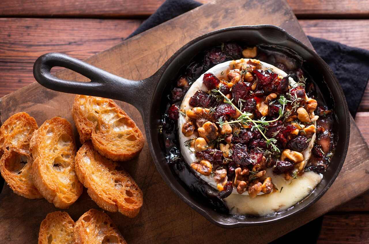 - Baked brie with cranberry chutney: Baked brie is a crowd pleaser. You can find it at specialty cheese shops or in the frozen foods section at the grocery store. If you pick up a premade, frozen variety, simply follow the instructions on the box to bake it in the oven. Make sure to get some delicious cranberry chutney to accompany the brie. Either layer it on top of the baked brie or put it in a dish on the side. The cranberry flavor will add a seasonal touch to the cheese. Serve the baked brie with crackers or bread so guests can slather slices with this warm delight.