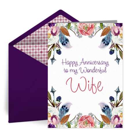 - Free eCard Anniversary Greeting for Her: When you send an anniversary card to your wife, make sure you choose a beautiful design like this Wife anniversary card and add a beautiful message. Recall the first moment you saw her, or the moment you knew you wanted to marry her. You may want to consider sending a premium design like the one below. Schedule the ecard to appear in her inbox a few minutes after she arrives at work in the morning, or first thing when she wakes up.