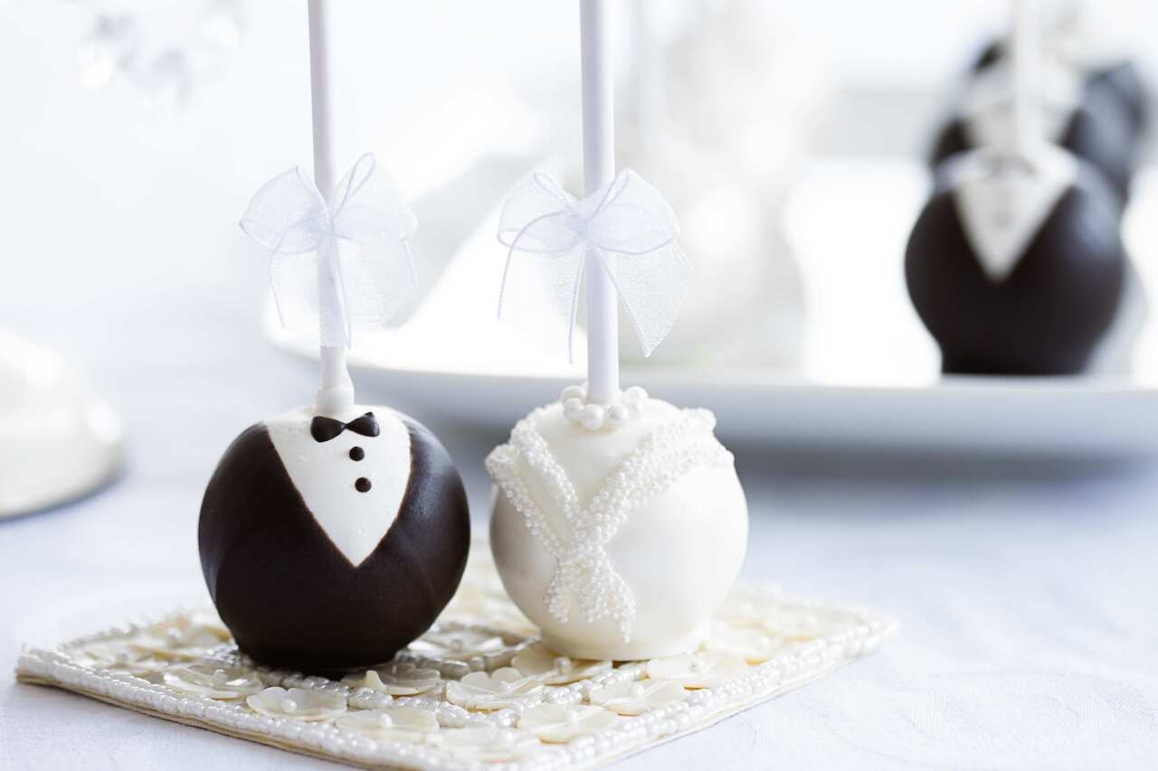 - Bride and Groom Cake Pops: Cake pops are a fabulous dessert option for an engagement party. These bite-sized goodies do not require plates or cutlery, and look beautiful as part of a dessert bar. Ask your local bakery to create engagement party cake pops using a bride and groom theme. Choose the bride's favorite cake flavor for the cake pop filling. Your guests will love these whimsical and elegant desserts.