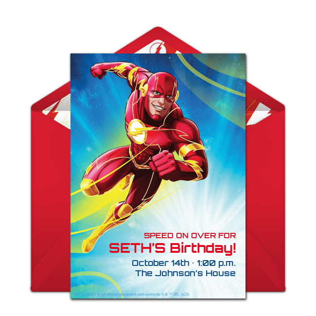 Send The Flash birthday invitations for a speedy way to organize your party. Incorporate red and yellow throughout your space along with plenty of lightning bolts. Keep the red and yellow color scheme going with your food: serve strawberries and pineapple, pigs in a blanket with ketchup and mustard, and grilled cheese sticks with tomato soup.