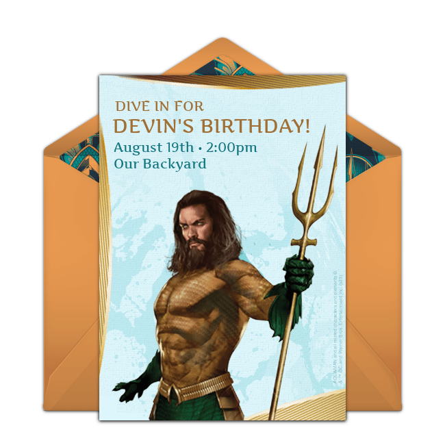 aquaman-invitations.png311.78 KBOnce you've emailed or texted your Aquaman birthday invitations, purchase decorations in Aquaman’s green and gold (or orange). Alternatively, you could use blues and greens along with seashells, starfish, fishing net, and other oceanic elements for an under-the-sea vibe. For snacks, serve plenty of Goldfish, chips and Seaweed Dip (spinach and artichoke dip), and Shark Bait Popcorn.