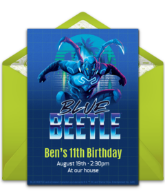 After you’ve sent your Blue Beetle invitations, it's time to think about decorations and food (think blue!). Snacks and drinks can include blueberries, Concord grapes, blue corn chips or Takis, and blue lemonade (simply combine blue fruit punch, lemonade, and Sprite). For dessert, check out these Blue Beetle cupcakes for inspiration.