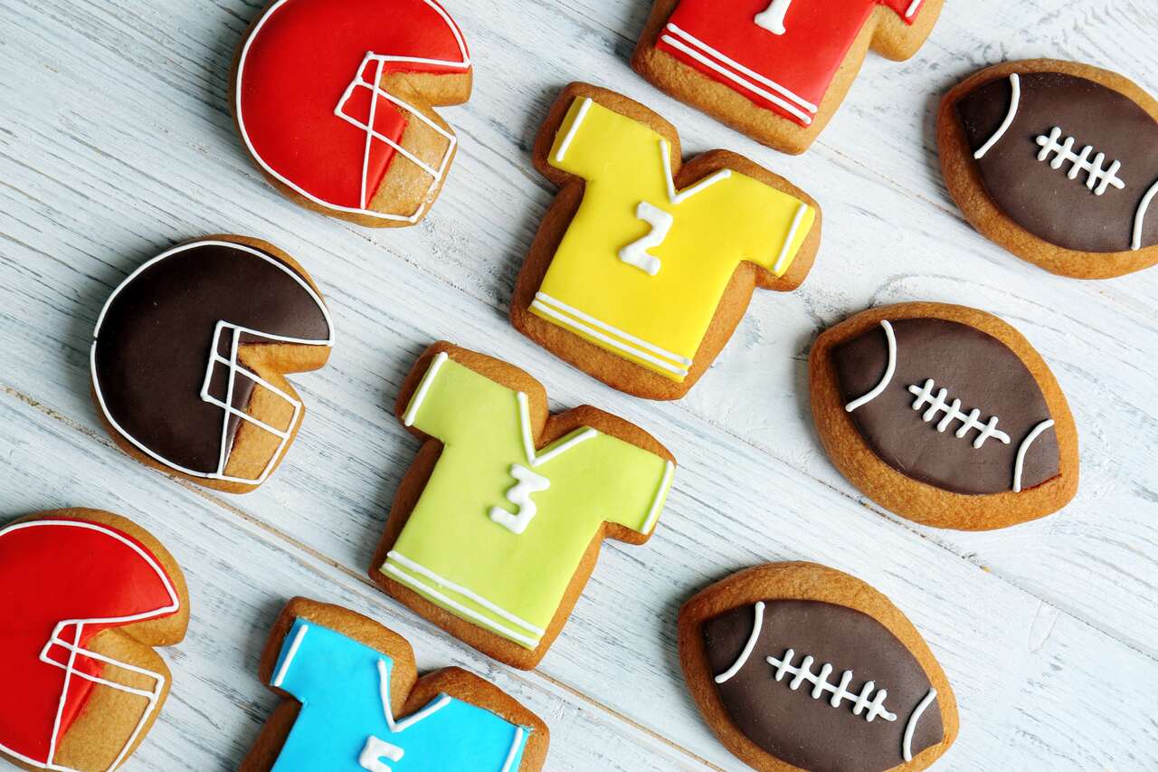 To start, bake a batch of sugar cookies in the shape of a football, jersey, or helmet using cookie cutters. Once the cookies are done baking and have cooled down, take out the essential cookie decorating materials (frosting, sprinkles, candy, etc.) to get the kids setup for decorating.