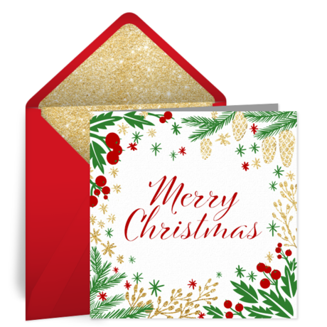 Browse the selection of free Christmas eCards on Punchbowl to find many different styles of cards. Think about who your recipient is. You’ll probably want to send Grandma a different card from your best girlfriend or younger nephew. There's something for everyone, whether you’re looking for a Merry Christmas eCard or a more general winter wishes message.