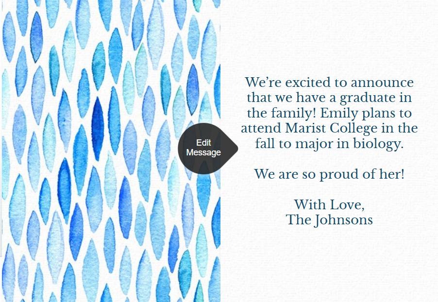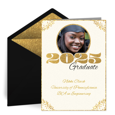 In some cases, friends and family haven't been in the loop, so hearing about the graduate's latest accomplishment with free graduation announcements cards is a nice touch. Customize the graduation announcements with the name of the school, the date of the graduation and a little bit about the graduate's plan for the future. Need help with what to write inside the card? Check out these graduation announcement wording examples. graduation-announcement-online-card.png135.94 KB