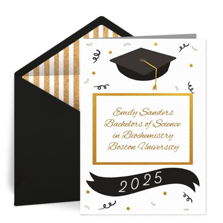 Make sure everyone in your life knows the big news and send free high school graduation announcements or free graduation announcements for college today. Once you send your announcements, take a look at online graduation party invitations too!