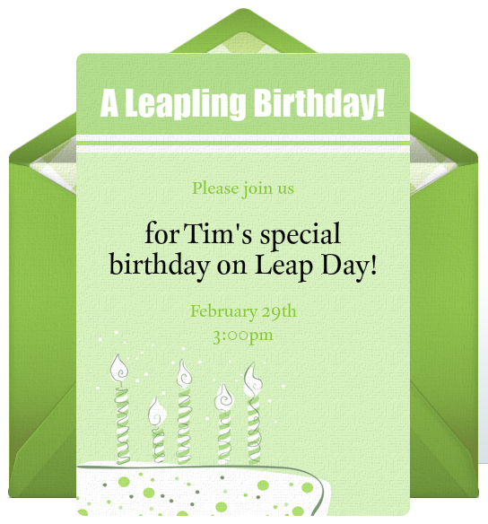In honor of you or the Leapling guest of honor, send the free Leapling birthday invitation well in advance to make sure everyone can make it. Make sure to include all the relevant details, the location, what to wear, where to park, etc. If the party has a theme, make sure to mention this on the free Leapling birthday invite too. Some fun Leap Day party themes include a fortune telling party complete with fortune tellers, ouija boards, and tarot card readings, or a favorite destination party like Paris, Mexico, or the great outdoors.
