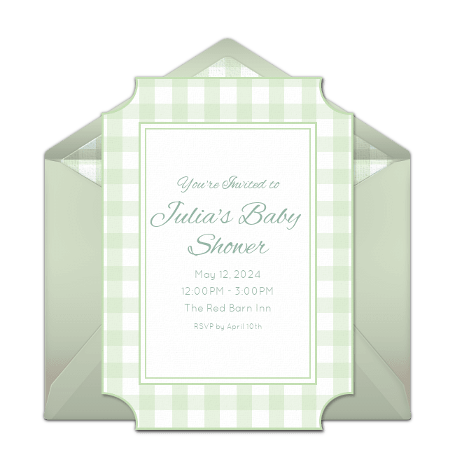 Keep it simple with fun patterns! Customize this Polka Dot baby shower invitation or this Gingham baby shower invitation then incorporate the theme into the balloons, tablecloths, favors, and more. Choose colors that are gender neutral such as green, yellow, orange, and gray. A fun candy buffet in matching colors can be a sweet way to end the shower (and also doubles as a favor!).