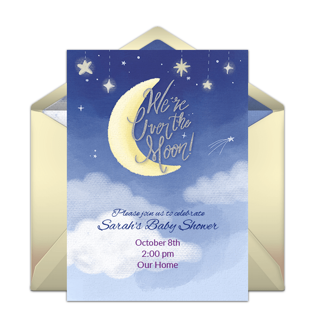 Incorporate a beloved lullaby into your theme with this Twinkle Twinkle baby shower invitation or send this Over the Moon baby shower invitation to let guests know how excited you are about your little one's arrival. Decorate in blue, gold, and silver and place twinkling lights throughout your space. Use star and crescent moon cookie cutters to turn sandwiches into fun celestial shapes.