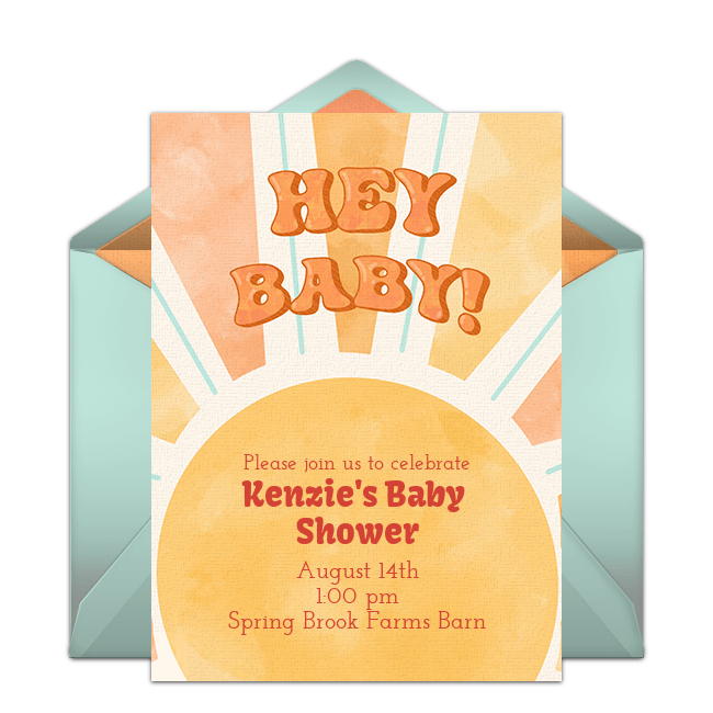 Keep it upbeat with a sun themed baby shower! Send this Ray of Sunshine baby shower invitation or this Retro Sun baby shower invitation to set the stage for your event and use cheery yellows and golds in your decorations. For centerpieces, place sunflowers or gerber daisies in mason jars wrapped in colorful ribbons. This gender-neutral baby shower theme is perfect for any season, and will really shine in spring or summer months.