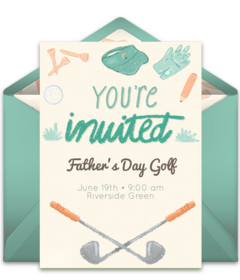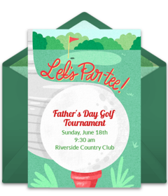 Send Dad and a few of his buddies or family members an online Father's Day golf invitation to a tee time at his favorite golf course (all expenses paid, of course). Customize your favorite invitation with important event details, send via text or email, and gather RSVPs in minutes.