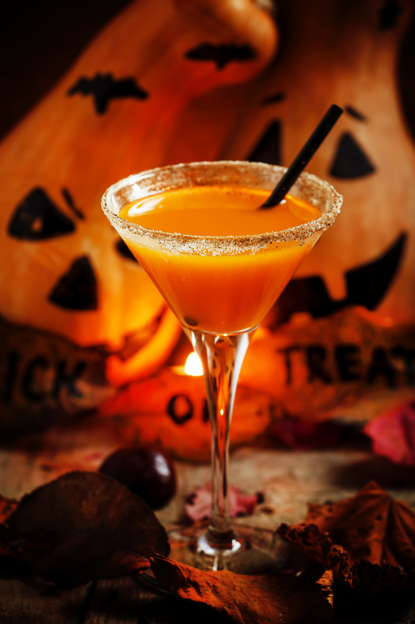 - Pumpkintini: Make a pumpkintini cocktail for a sophisticated Halloween party drink. Enjoy the rich, buttery flavor. It’s perfect for a cool October night with friends! To make it, combine 2 oz. of chilled vodka and .25 oz of pumpkin liqueur with some ice in a cocktail shaker. Shake the mix well and serve. Slice a notch in a piece of candy corn and stick it on the rim of the pumpkintini. This cocktail will add that extra little bit of Halloween flair to make the holiday special!