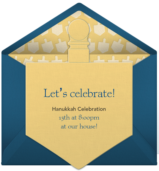 Plan the date of your Hanukkah party far in advance and make sure to send your Hanukkah party invitations, with appropriate Chanukah party invite wording. Leave plenty of time to spare before the holiday to ensure guests book your event on their calendars. Visit Punchbowl.com for a large variety of different Hanukkah invitation options, and add the perfect Hanukkah party invitations wording.