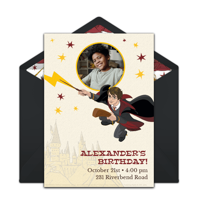 To start, set the stage for your event and build excitement among guests with online Harry Potter invitations. Browse a wide range of Harry Potter invitations that feature Hogwarts, Harry and his crew, Hedwig, and more. Customize your favorite invitation with important event details, deliver instantly by text or email, and gather RSVPs in minutes.
