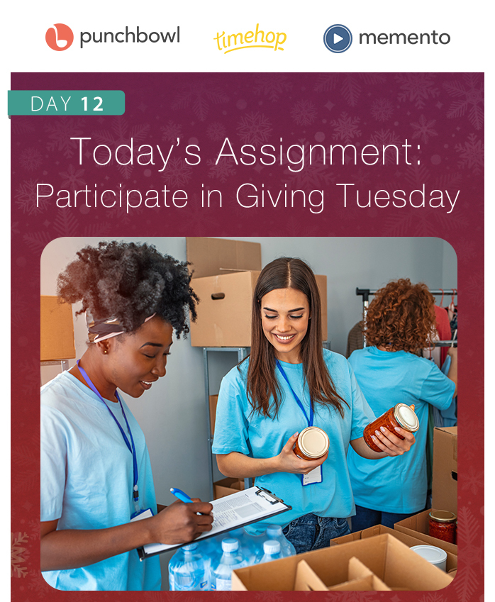 The 25 Days of Holiday Memories is a collaboration from Punchbowl®, Timehop® & Memento® where we help you get organized and make the most of the holiday season. Sign up here and get daily assignments delivered to your inbox.