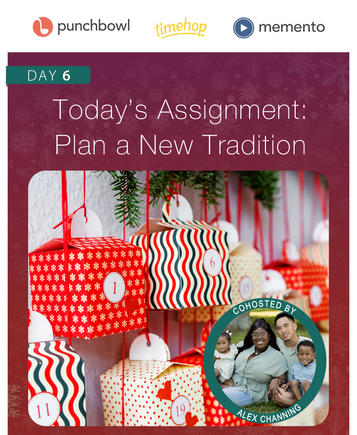 Follow Alex & The Fam to see what new holiday tradition Alex is cooking up, and tell us what you plan to try. Post with #25DaysofHolidayMemories and tag our family of brands @punchbowl @timehop and @trymemento for the chance to be featured.