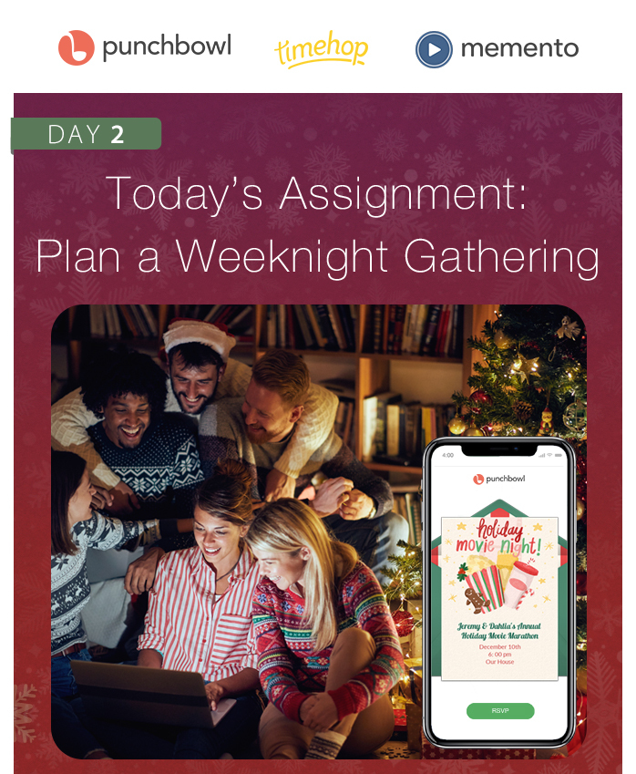 Day_2_Article.jpg492.07 KB The 25 Days of Holiday Memories is a collaboration from Punchbowl®, Timehop® & Memento® where we help you get organized and make the most of the holiday season. Sign up here and get daily assignments delivered to your inbox.