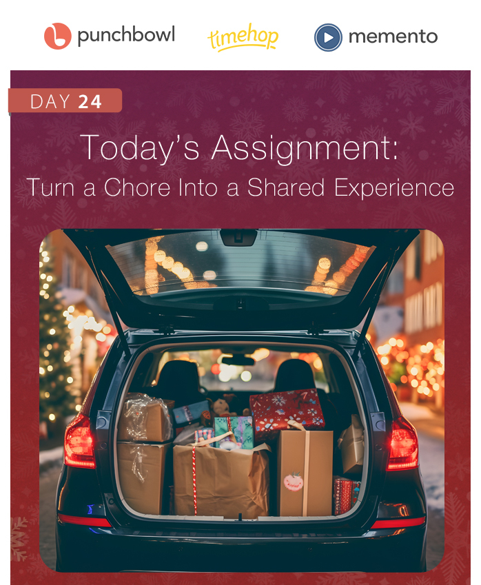 The 25 Days of Holiday Memories is a collaboration from Punchbowl®, Timehop® & Memento® where we help you get organized and make the most of the holiday season. Sign up here and get daily assignments delivered to your inbox.