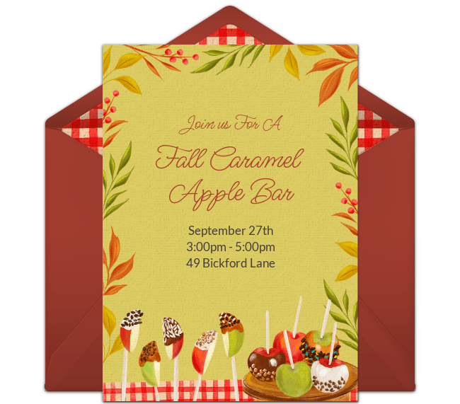 Want friends to join in? Host a Caramel Apple Bar party so guests can dip and decorate their own apples! To start, send an online Caramel Apple Bar invitation to guests by text or email then gather your supplies.