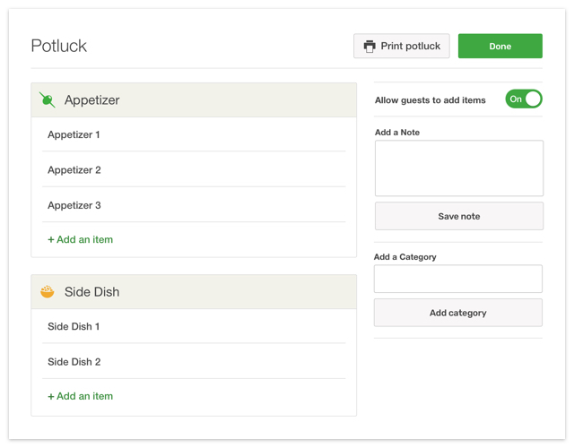 Once you text or email your invitation, guests will RSVP and select what they’ll bring to your potluck. Tip: While it might be tempting to let guests write in what they'll bring, you might want to consider giving them some direction on what to bring instead of leaving it completely up to them. For example, if you've got a craving for some loaded nachos, give your guests the option to sign up for this dish! Or maybe you think spicy chicken wings are a must-have for your Super Bowl party — make that clear on your potluck list as well.