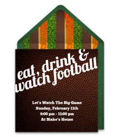 To start, browse digital Super Bowl party invitations and pick your favorite design. Add important event details then take advantage of the easy-to-use Potluck Feature to organize your potluck. Create a potluck list and specify how many items you need in each food category (drinks, sides, appetizers, etc.) so you don't end up with ten desserts and zero appetizers! You can also request that certain guests bring certain dishes — that way your neighbor will be sure to bring those famous jalapeño poppers that everyone loves.