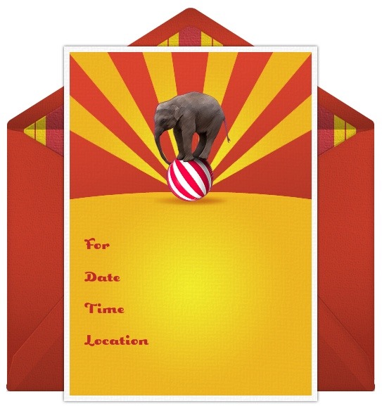 - Invitations: Send out circus themed digital invitations for your party. Punchbowl offers circus party invitations, like the one below in two color schemes. You can enter the basics about the circus party or write custom invitation text like “Come one, come all, and enjoy the fun! [Name]’s birthday circus has come!” These invitations will get your guests excited about the circus fun!