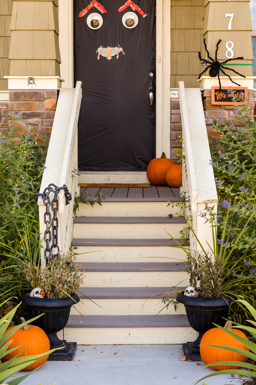 • Fill up white plastic trash bags with leaves and tie them up. On the outside, use a thick black marker to make creative pumpkin faces. They can be silly or scary based on the kids you know will be coming to the house. Place the final creation on the porch along with your carved pumpkins and cornstalks.
