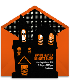 Scare up some little ghouls and goblins from your neighborhood when you send Haunted House online invitations conveniently by email or text. Browse digital Halloween party invitations like this whimsical Haunted House invitation or this black and orange Haunted House invitation, then deliver your favorite design from any digital device and track RSVPs online.