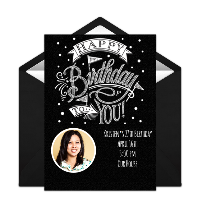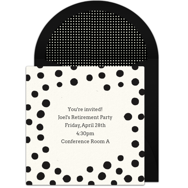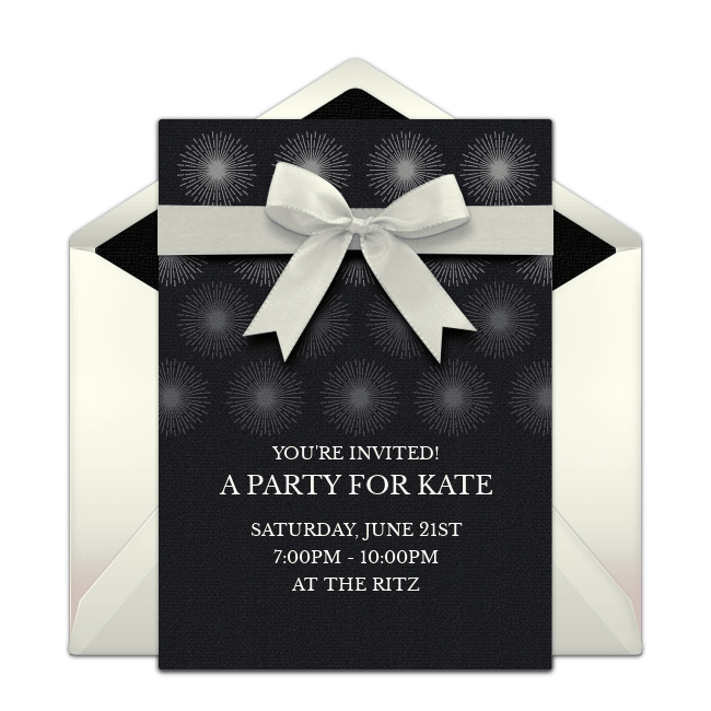 Browse free online invitations and find black and white invitations for any occasion! Be sure to let your guests know the theme of the party and specify what you'd like guests to wear (ie all white, all black, a combination, etc.). On your invitation, you can also let guests know if you'd like them to bring an appetizer, dessert, or drink. Punchbowl's Potluck Sign Up tool is ideal if you want to ask guests to contribute to the menu. Once your invite is ready, deliver it instantly by email or text and easily track RSVPs online.