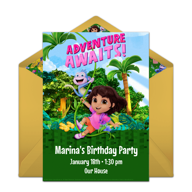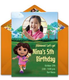 To set the stage for your Dora party, customize online Dora invitations! To start, browse gorgeous designs that include Dora and her rainforest pals (you can even upload your favorite picture of the birthday kid to this Dora Photo invitation!). Once you pick your favorite Dora birthday invitation, add all the information your guests need to know - location, date, time, and any other important details. Next, send these adorable Dora birthday invitations via email or text and easily track RSVPs online.