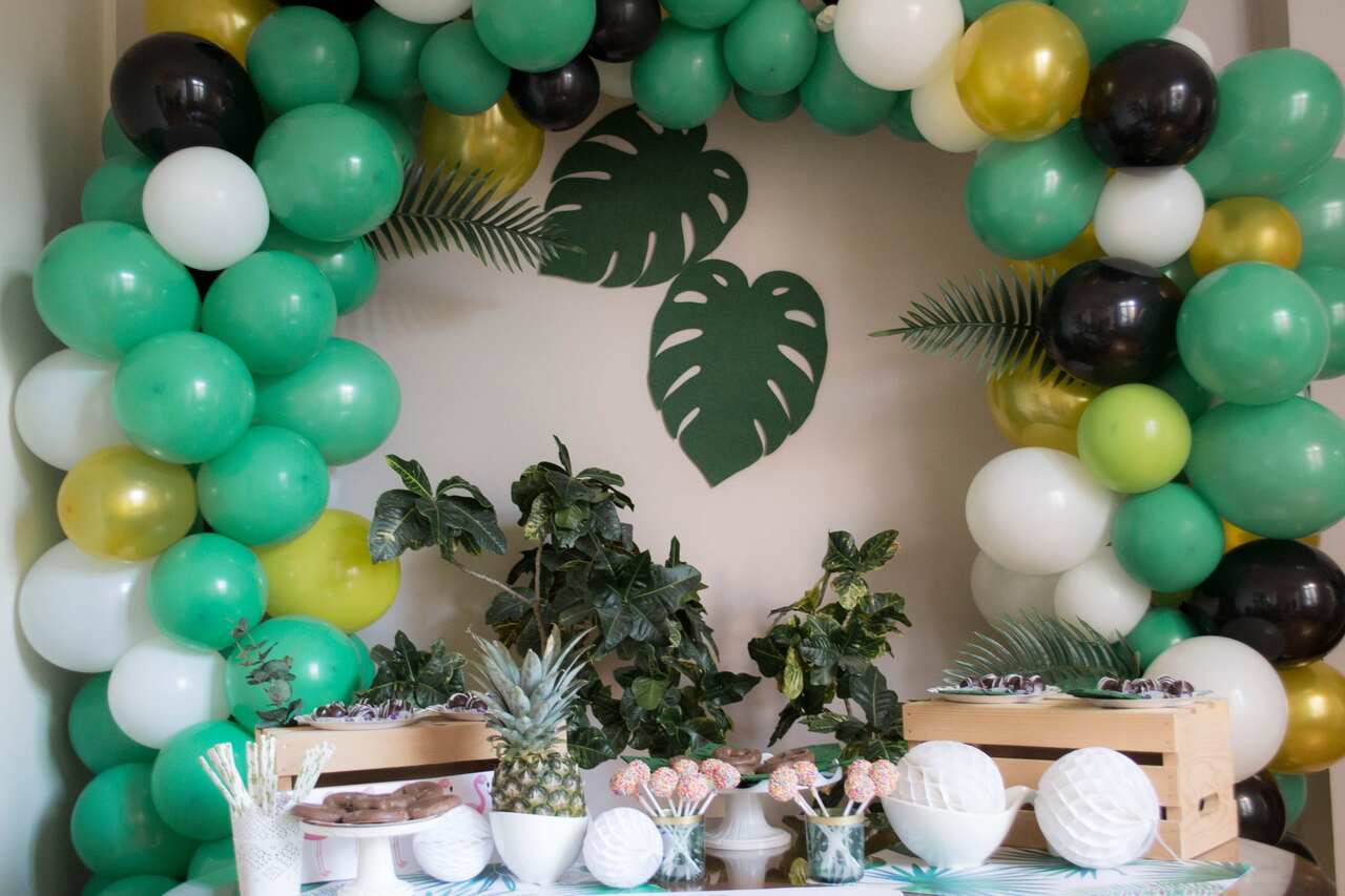 Set up a lovely rainforest setting with green balloons, streamers, and real or fake plants. Decorate with pops of vibrant colors like orange, purple, and pink banners, streamers, and balloons. Also, be sure to incoprorate plenty of butterflies and flowers throughout your party space. Finally, signs with phrases in Spanish are an excellent finishing touch (did you know that "selva tropical" is Spanish for "rainforest"?).