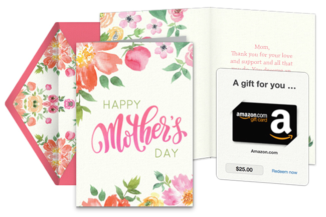 Gift Cards: Once you pick your favorite Mother’s Day card, our platform will automatically prompt you to add a gift card to your card. Spend some time thinking about the recipient’s interests then browse our collection of Mother’s Day gift cards you can send online, which include Amazon.com, Sephora, Panera, Target, Lululemon, and more. You can email Mother’s Day gift cards from any device or text Mother’s Day gift cards right from your phone.